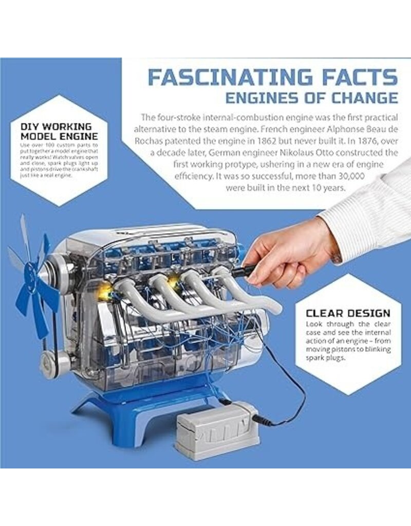 Does your child dream about creating the next greatest invention? Want a fun, exciting way to keep them entertained? Let your little girl or boy get hands on with this build it yourself mini replica of a classic four cycle internal combustion gasoline car engine! This intuitive, engaging gadget allows children to play around with the valves, cylinders, cranks, and pistons all in one dazzling toy. It also delivers powerful action using the provided cables and battery pack distributor to bring on nonstop fun anyone will love! Deliver this amazing toy for your favorite little engineer with Discovery™ #Mindblown DIY Model Engine Kit! It's a great way for anyone to explore their creativity, expand their critical thinking skills, and dive into the world of mechanical engineering!