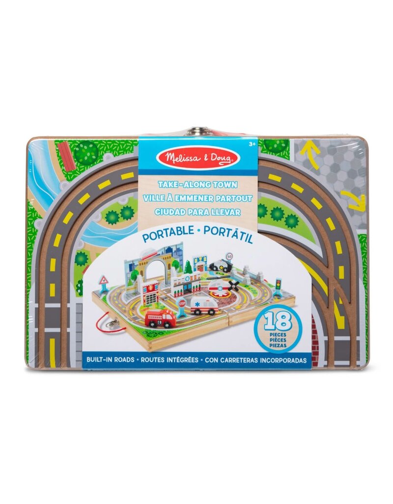 Built-in tracks, colorful scenery, and fun play pieces let kids take their imaginations for a spin . . . and take playtime anywhere they want to go! Unfold the sturdy wooden case to create an illustrated play surface with built-in road tracks for the three wooden wheeled vehicles (a police car, ambulance, and fire engine) and a wooden helicopter to race to the rescue. Set up a bridge and a city tunnel with a monorail that slides across the top! Wooden play pieces include buildings, traffic signs, and a tree to enhance imaginative storytelling. All the pieces store in the fold-up case with convenient carrying handle for easy cleanup and travel (there's plenty of room to add other toys, too!). Keep playtime rolling for kids three and older and encourage independent play and motor skill development.