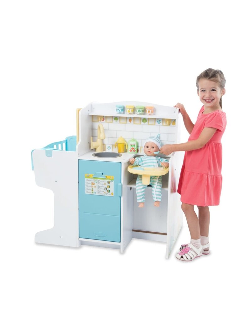 This multi-functional doll and stuffed animal baby care activity center has everything kids need to nurture and play with their special babies! The sturdy wooden center includes a kitchen with refrigerator, sink, and high chair. A changing and bathing area features a bathtub with spray nozzle and flip-down changing mat, a mirror, wipes dispenser, diaper disposal, and washing machine with clicking dial. The nursery area has a rocking cradle, clothing storage, and shuttered window with a card that can be flipped to a daytime or nighttime scene. Detailed assembly instructions are included. Kids three and older will love having their very own space to nurture and care for their babies!