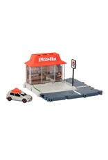 Drive up to the storefront where the doors automatically open and an employee with a pizza emerges. Vehicles making an official delivery can use the car topper that snaps on to the included Matchbox™ Volkswagen Golf.